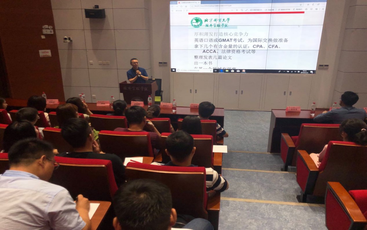 首先马晓飞副院长进行了热情洋溢的致辞,并介绍了北邮MBA的办学历程与专业特色、培养目标等。北京邮电大学MBA教育从1995年开始筹备,1998年正式招生。北邮MBA充分依靠和发挥北邮的工、管、文、理相结合的教育资源优势,尤其注重在通信与信息领域的研究,注重培养IT类的专业人才。培养目标重在培养信息社会富有创新精神的工商管理精英。最后马院长与新生分享了四个重要的关键词。分别是“理想”、“行动”、“坚持”、“超越”。他盼望新生们在职业发展道路上,超越自我。